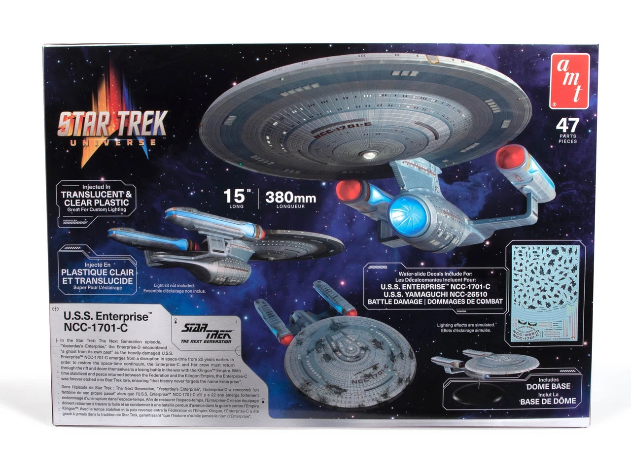 FEATURE PACKED: The U.S.S. Enterprise NCC-1701-C kit is injected in clear plastic making it perfect for lighting. The kit also includes hull markings for U.S.S. Enterprise NCC-1701-C and U.S.S. Yamaguchi NCC-26510, battle damage decals, and all new packaging. Lighting kit not included.