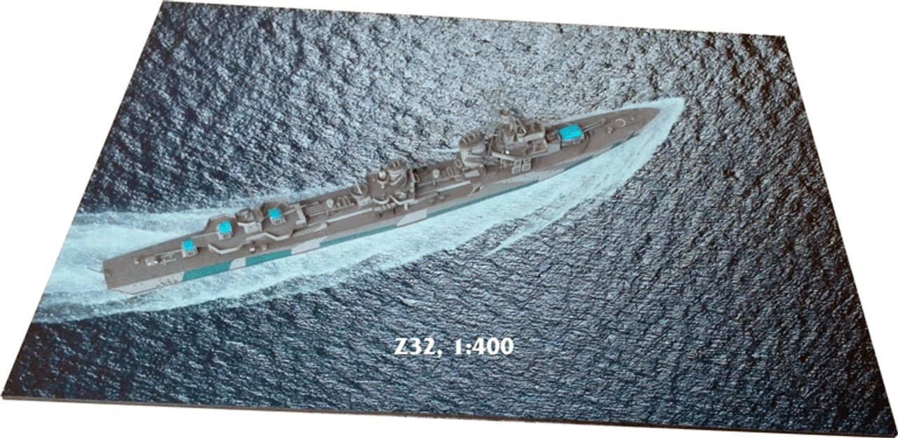 Images show 1:1200 USS Missouri and 1:400 Z32 for example application.