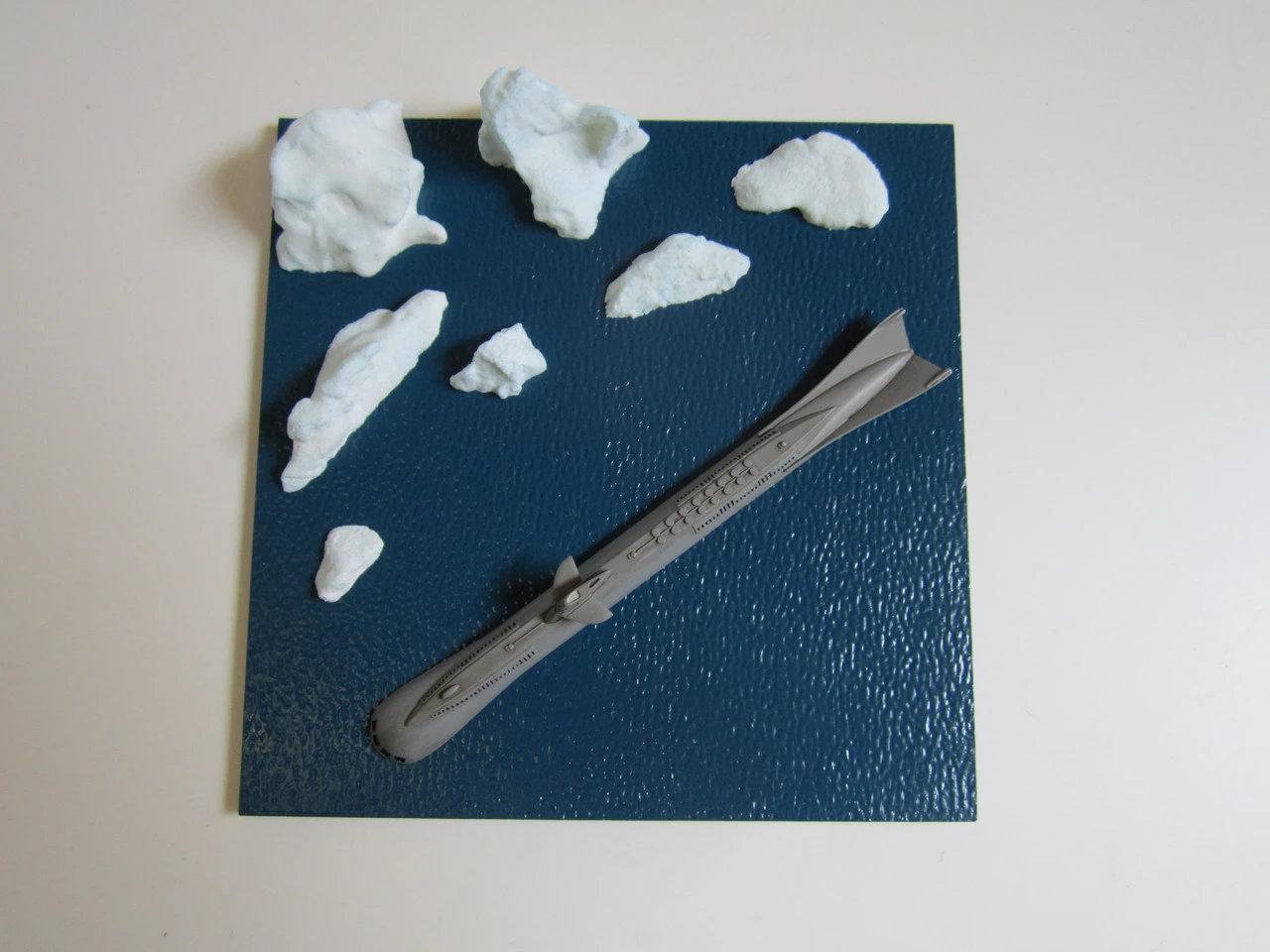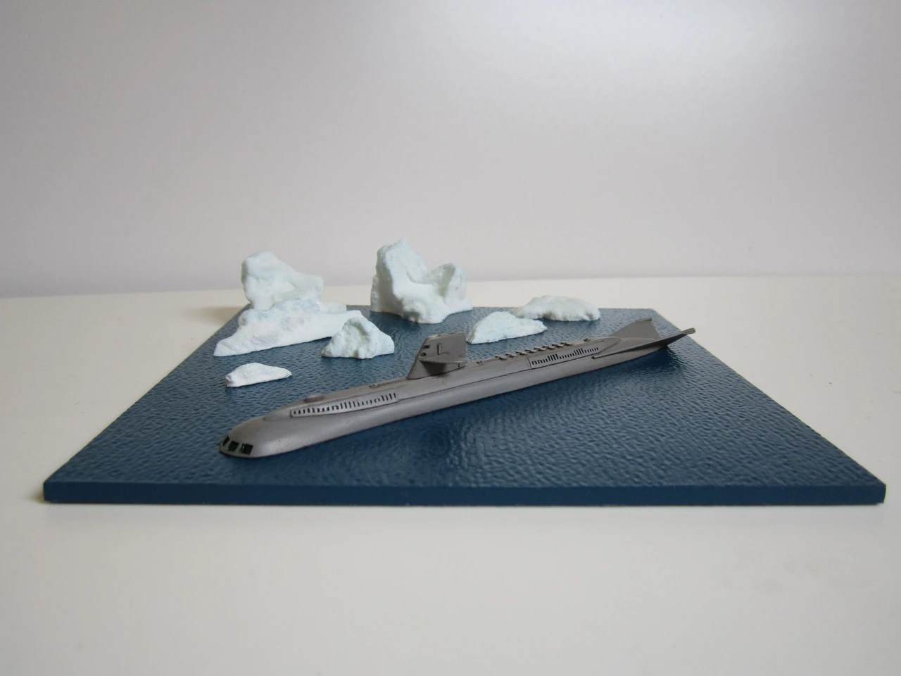 Seaview in Arctic Diorama is a 1/1200 waterline diorama model comprising a blue sea base measuring 150mm x 150mm, featuring melting icebergs, together with the submarine.