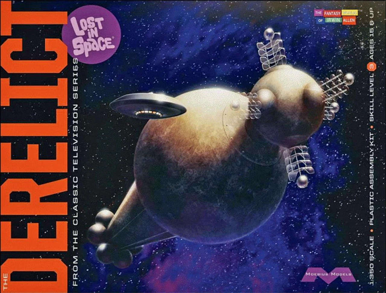 The Derelict as seen in the pilot episode of Lost in Space. The model is designed to allow you to build it as either the closed version, or open to accept the Jupiter 2 (also included).