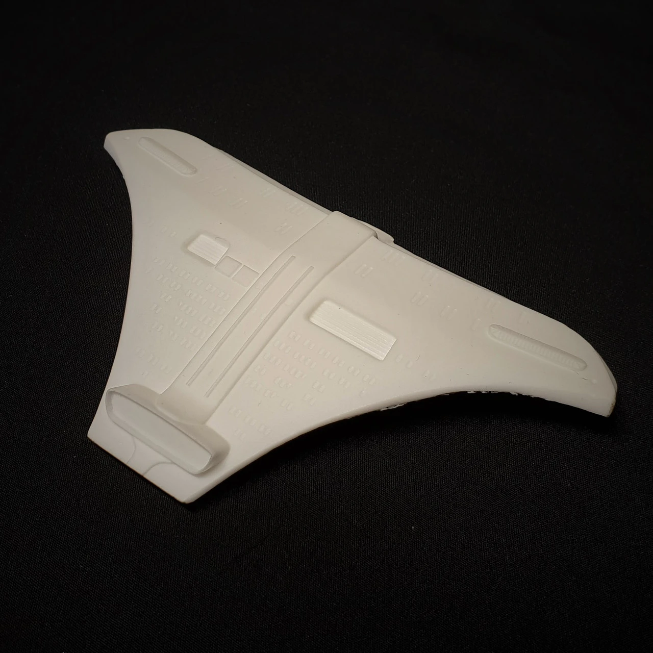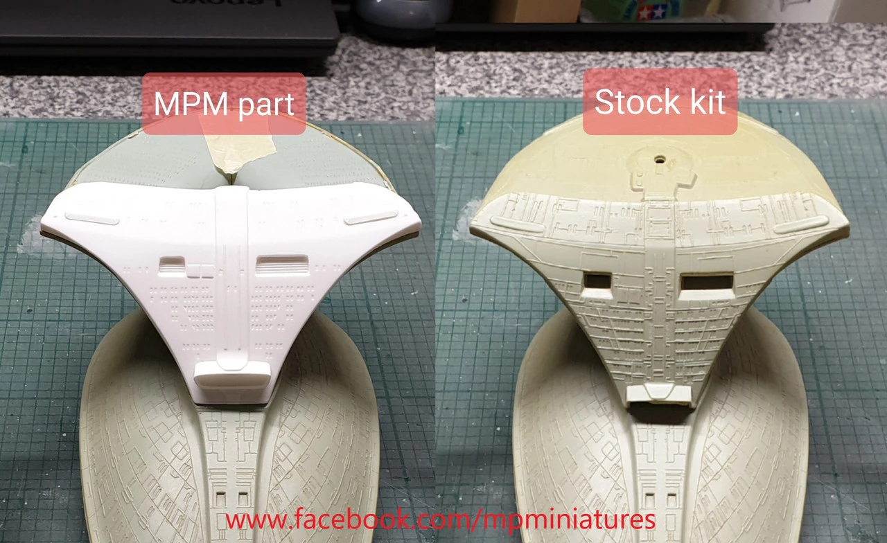 These parts are designed to be used with AMT/Round2’s 1/1400 scale Enterprise D kit, to bring the model closer to the original 6′ filming miniature as it was seen in the TV series and the movie “Star Trek: Generations”.