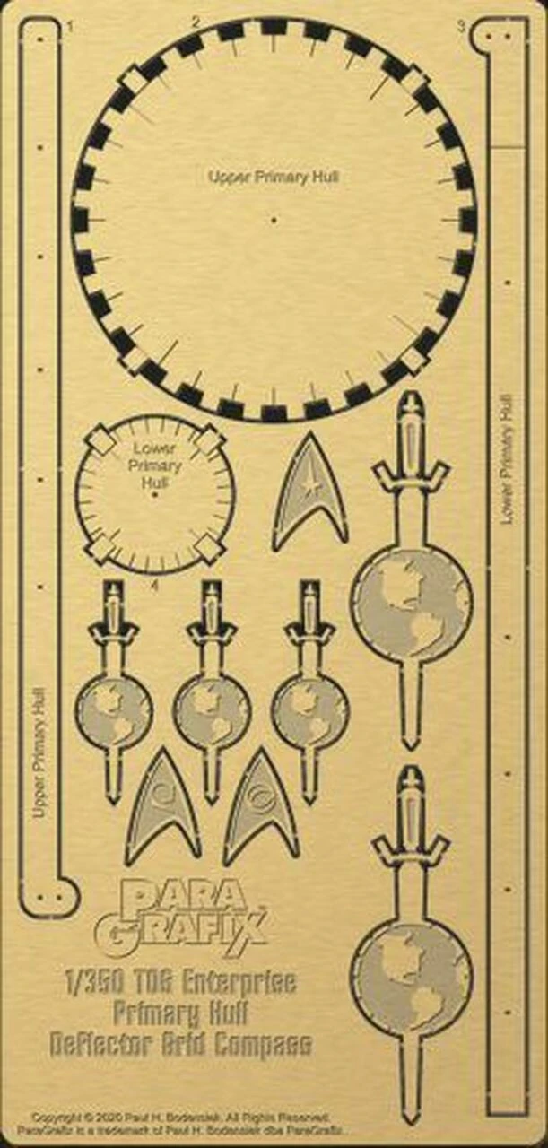 BONUS: Includes “Mirror Universe” Empire emblems for the ship, precisely scaled from the decals included in Polar Lights’ 1/1000 scale kit, as well as insignia for the three branches of Star Fleet service.