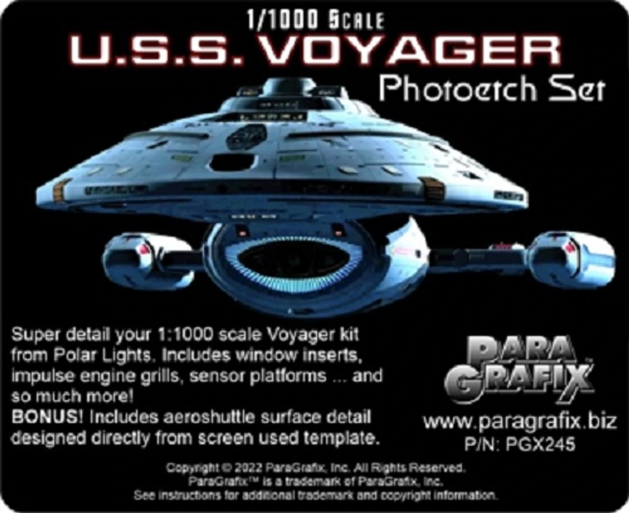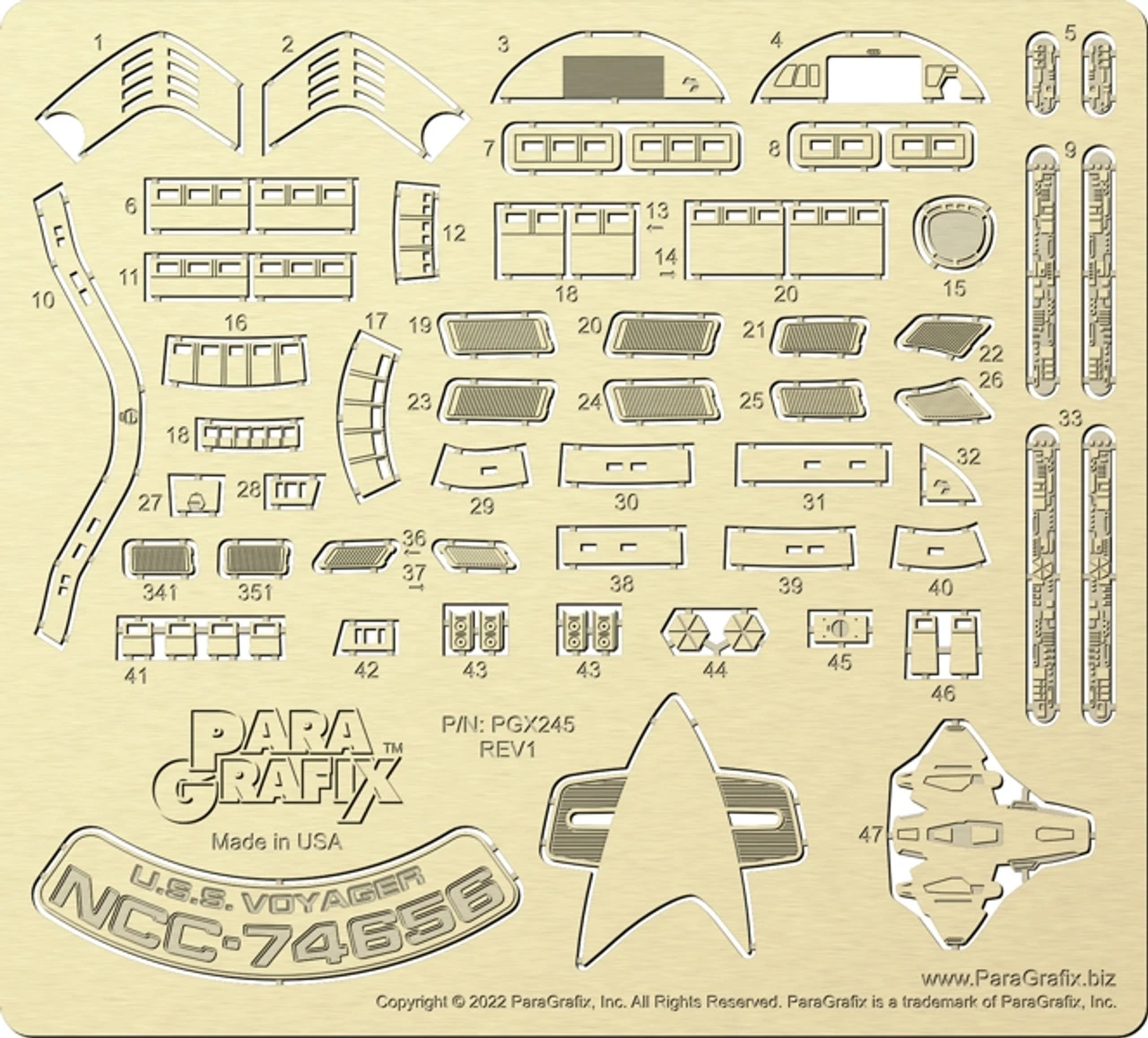 Update the 1/1000 scale USS Voyager kit from Polar Lights with raised-detail sensor pallets*, hinge covers, airlocks, and so much more! Includes easy-to-install light blocking panels for all clear window parts making lighting** a breeze.