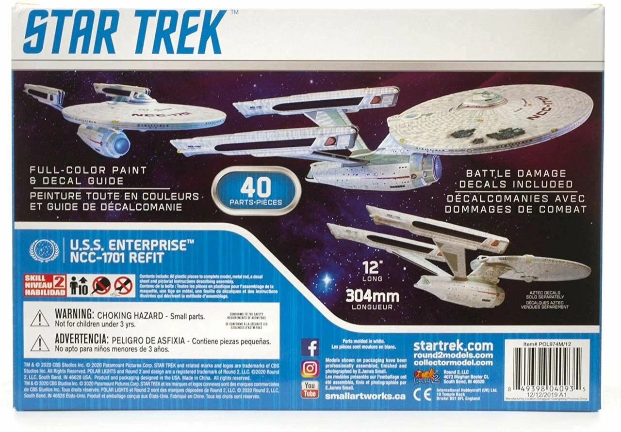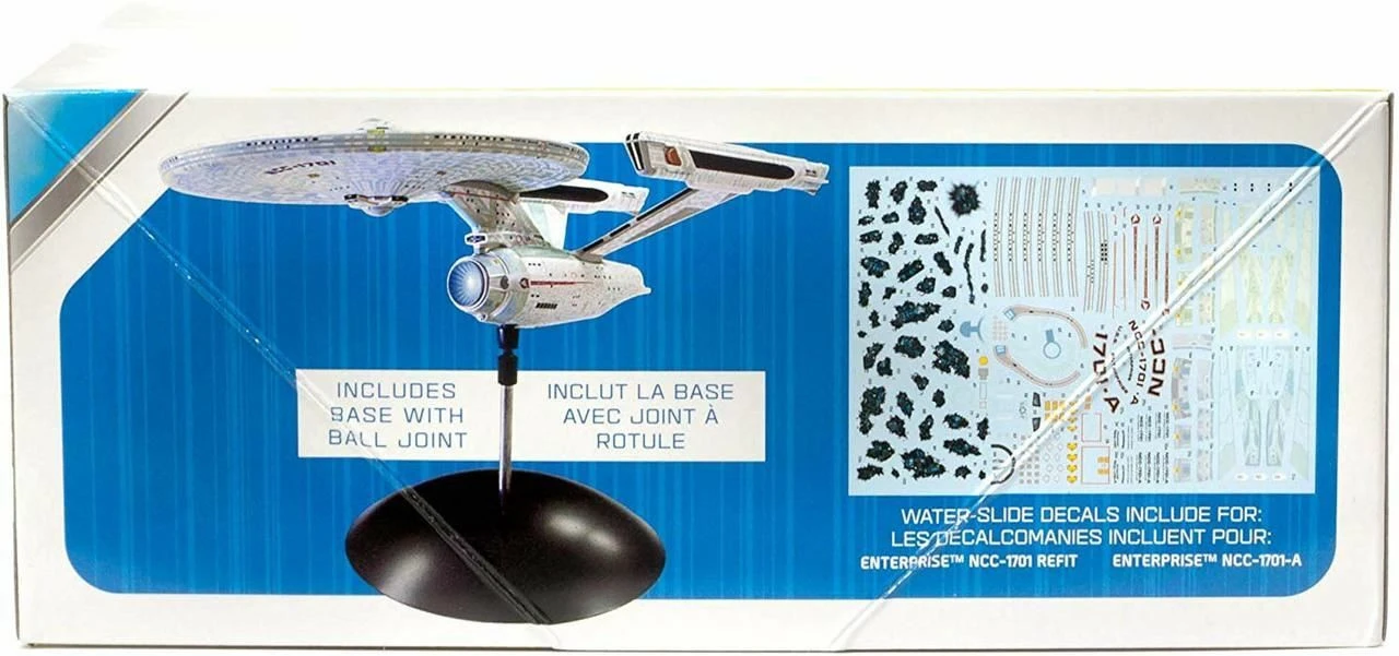 Reissue of the 1:1000 Refit Enterprise in new Wrath of Khan packaging. Over 12 inches when assembled. 35 parts. Kit includes battle damage decals. 40 parts. 12 inches when assembled. Includes full color paint and decal guide.