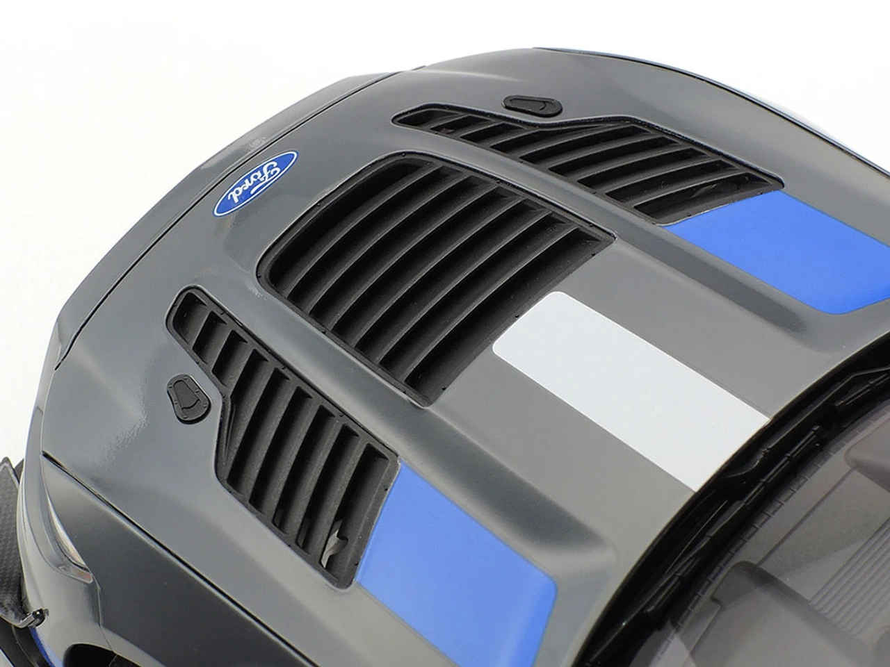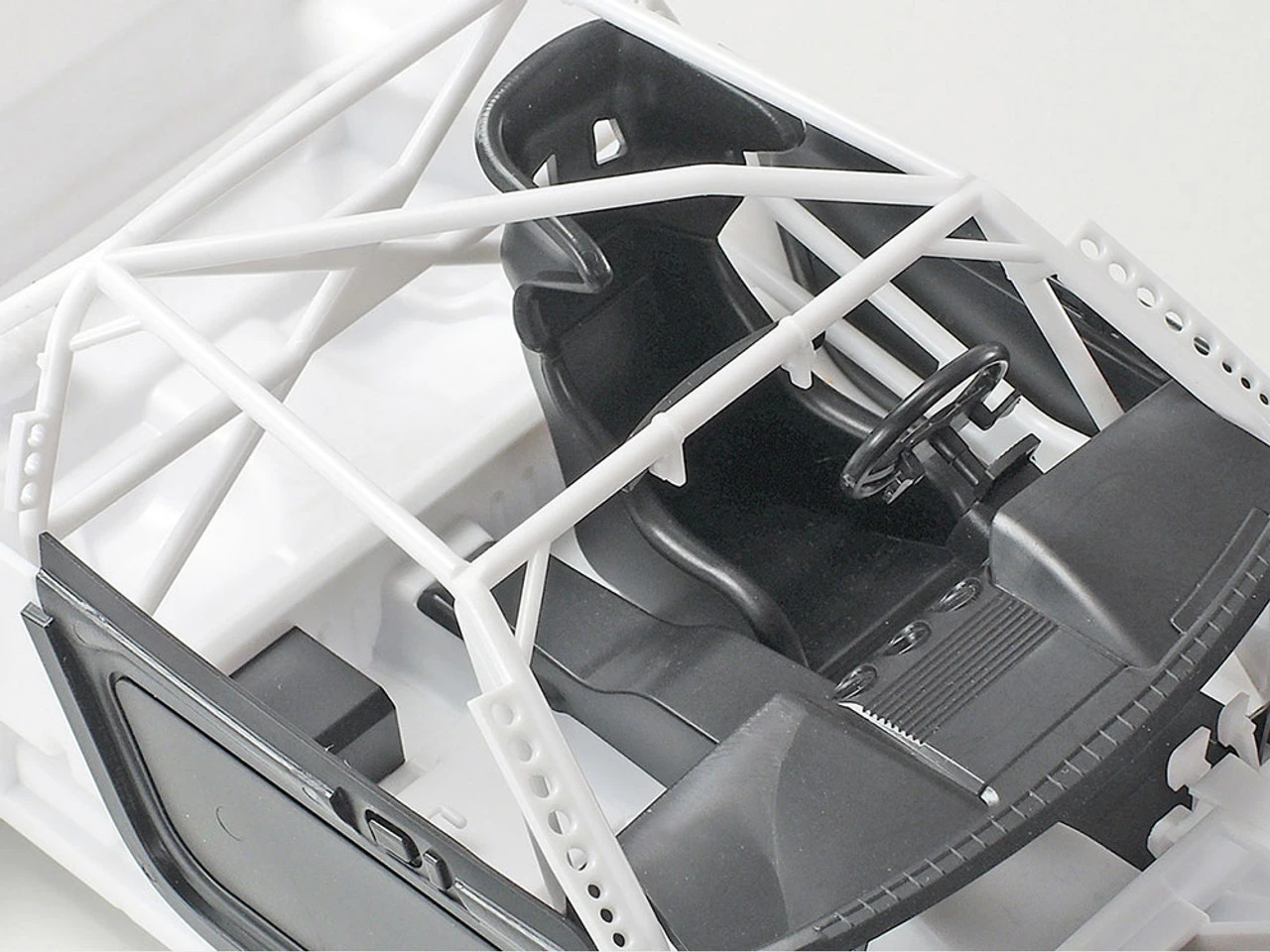 A realistically spartan interior features bucket seat and roll cage, with a decal-depicted Motec monitor. Separate parts are also used to depict the air jack compressor and various electronic equipment.